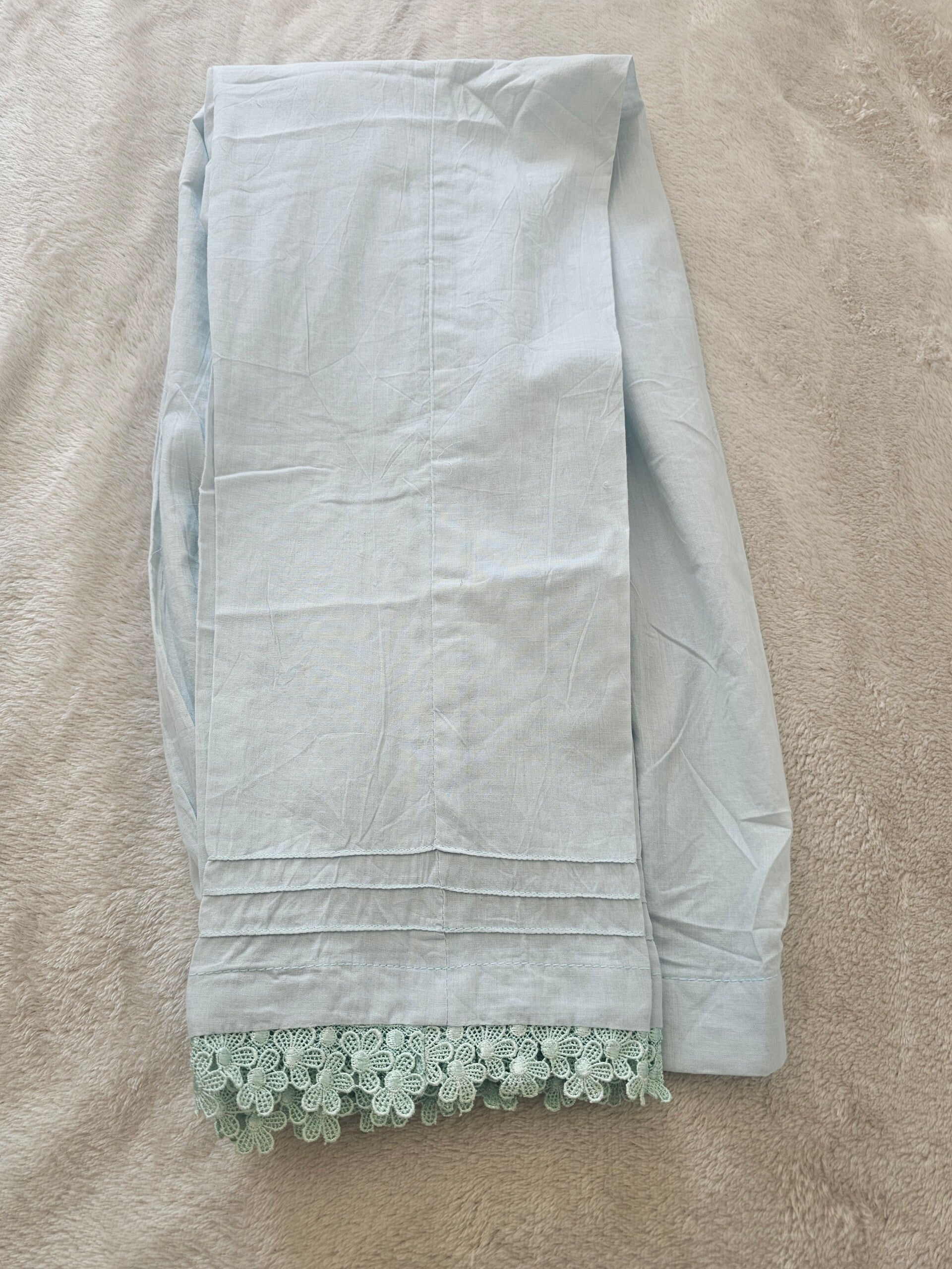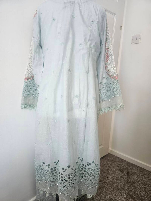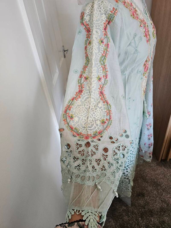 • Top Kameez): A beautifully detailed Chikankari work on soft, breathable fabric, embellished with delicate pearls and intricate patchwork, showcasing traditional craftsmanship with a modern flair. The embroidery runs across the front and sleeves, adding a graceful charm.