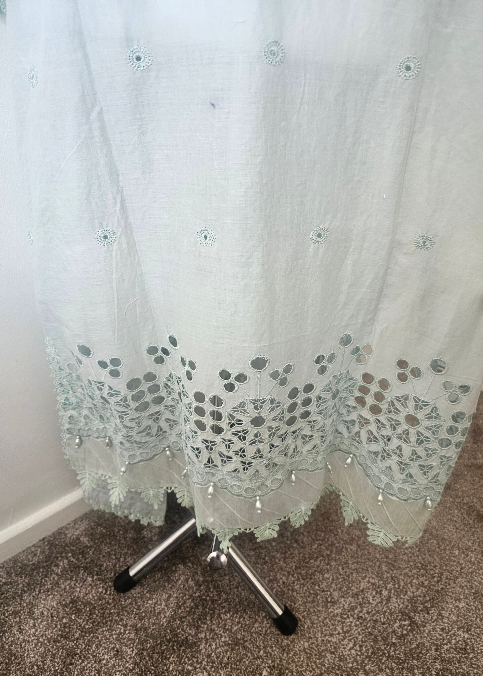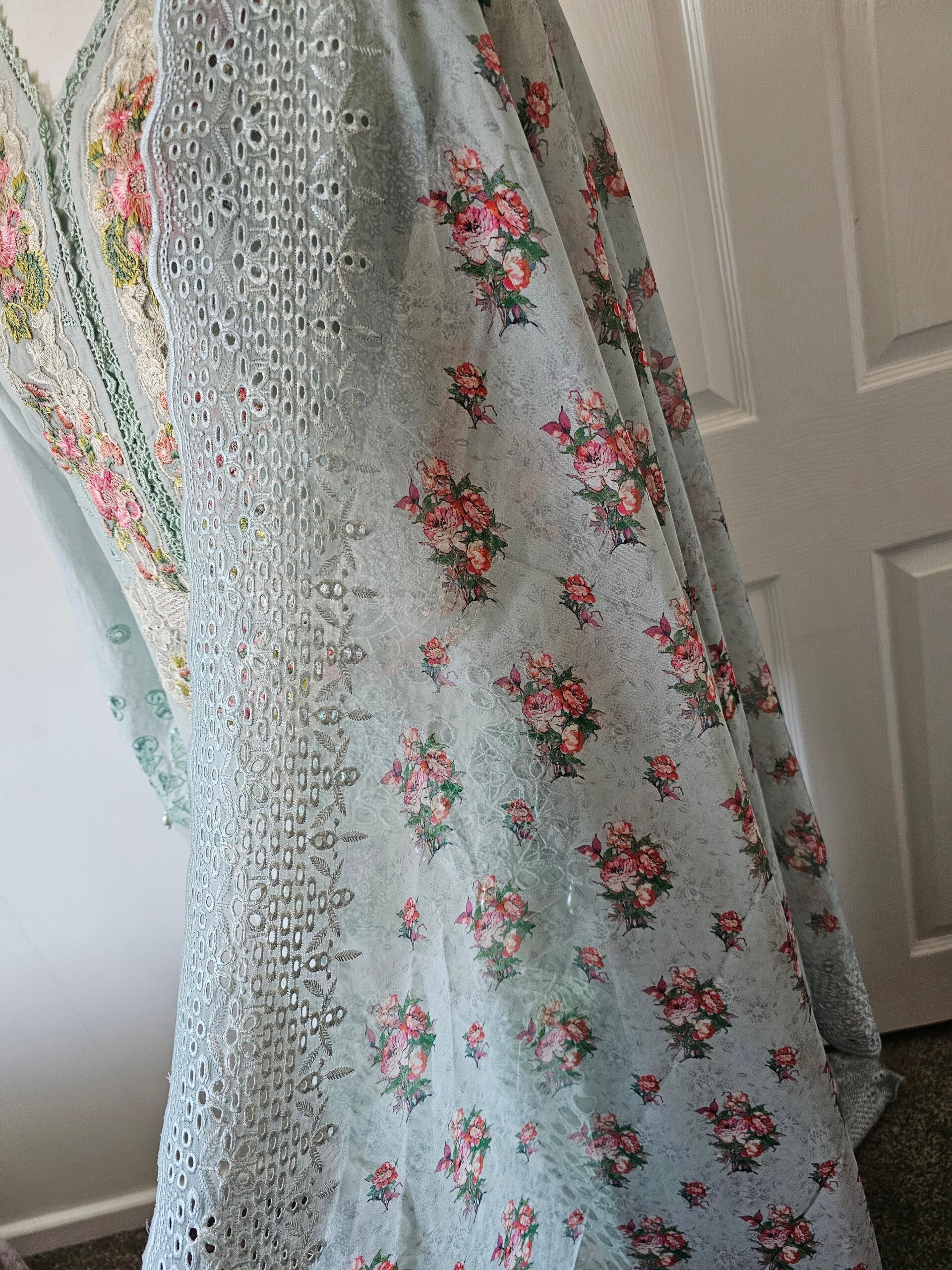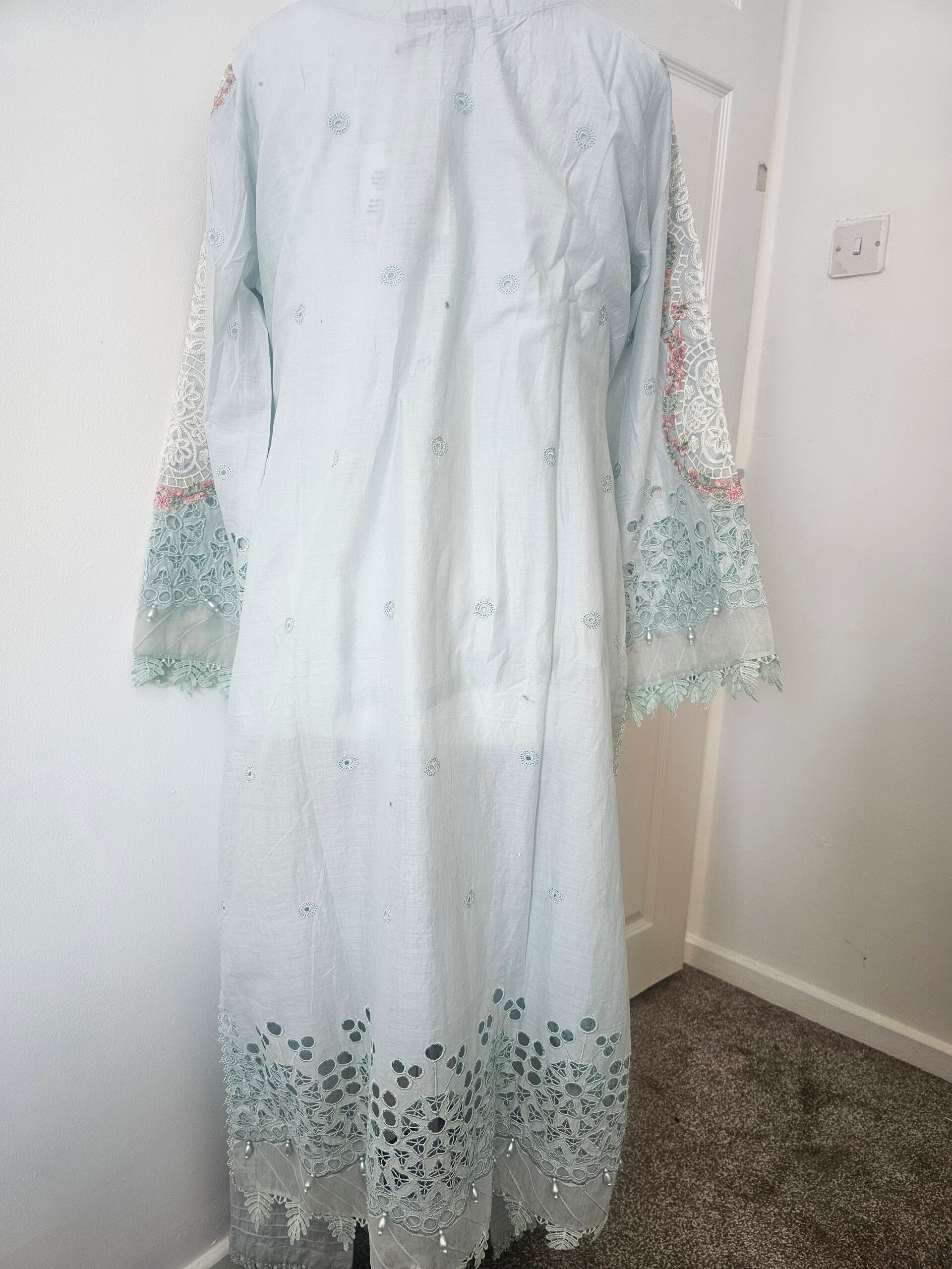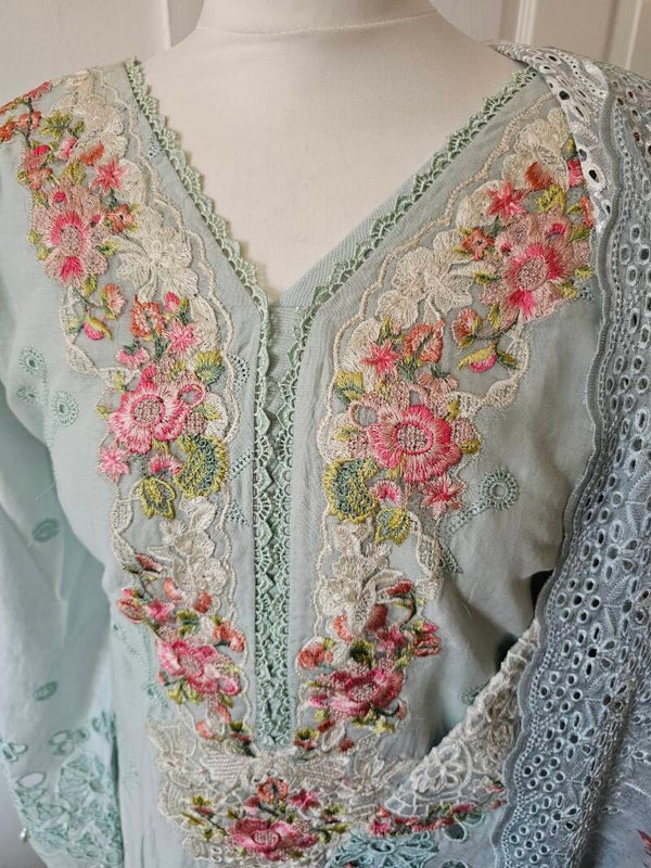 • Dupatta: A luxurious silk dupatta, adorned with elegant cutwork borders, giving a refined finish to the look. The silk sheen contrasts perfectly with the textured embroidery of the kurta.
