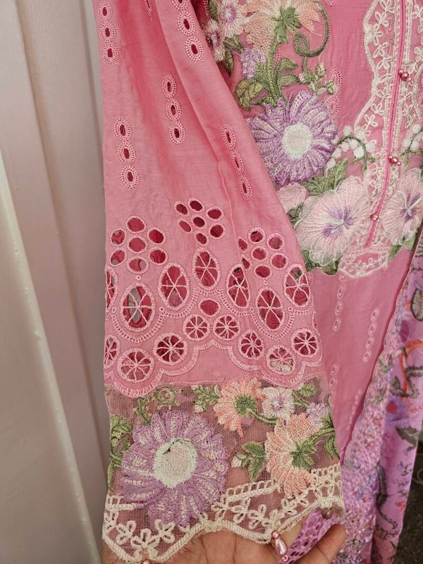 • Dupatta: A luxurious silk dupatta, adorned with elegant cutwork borders, giving a refined finish to the look. The silk sheen contrasts perfectly with the textured embroidery of the kameez.