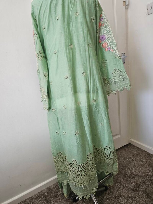 • Dupatta: A luxurious silk dupatta, adorned with elegant cutwork borders, giving a refined finish to the look. The silk sheen contrasts perfectly with the textured embroidery of the kameez